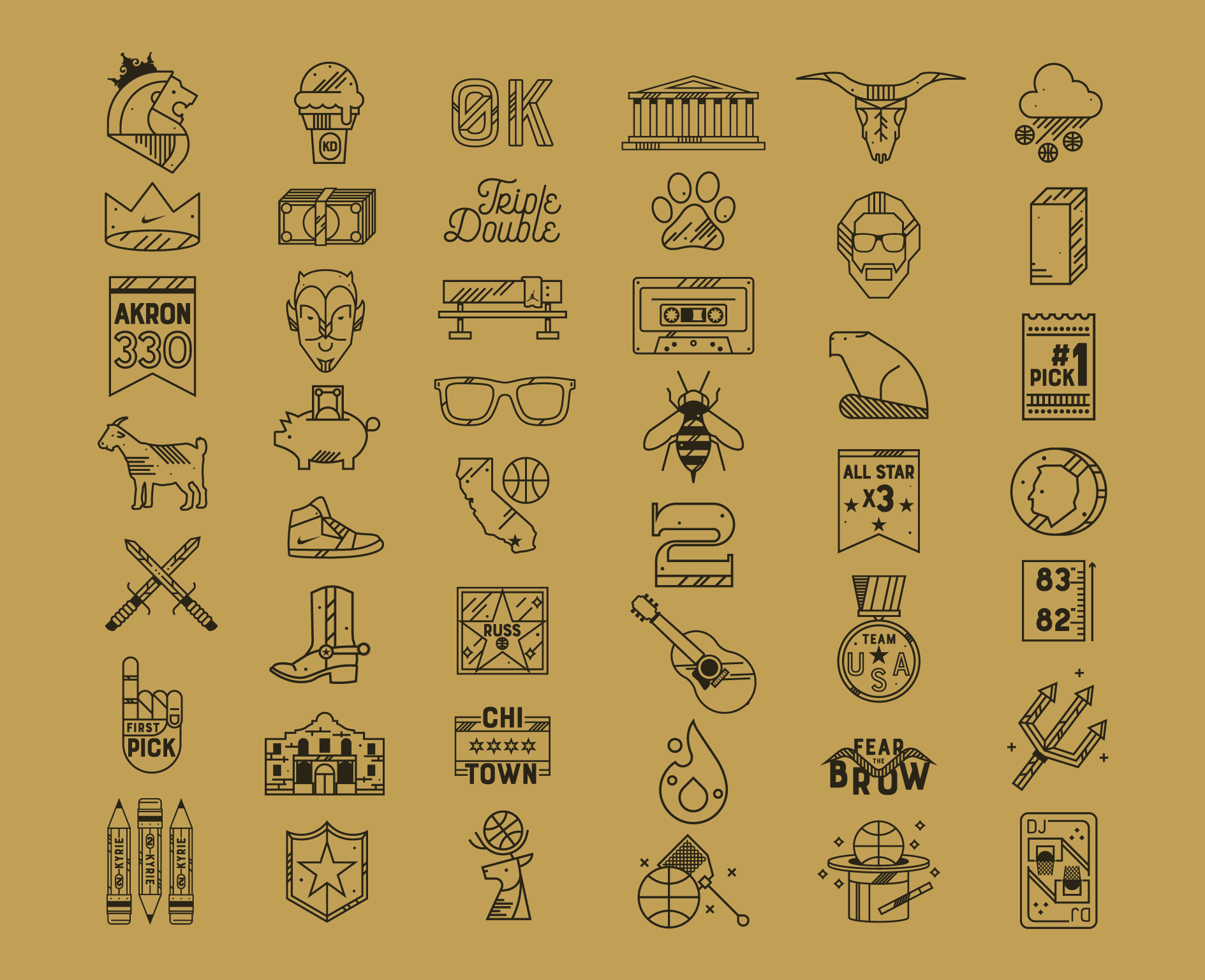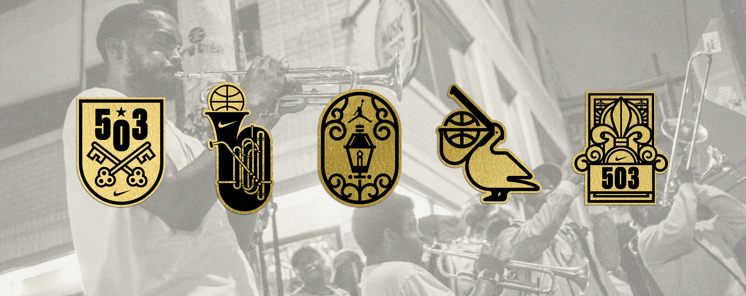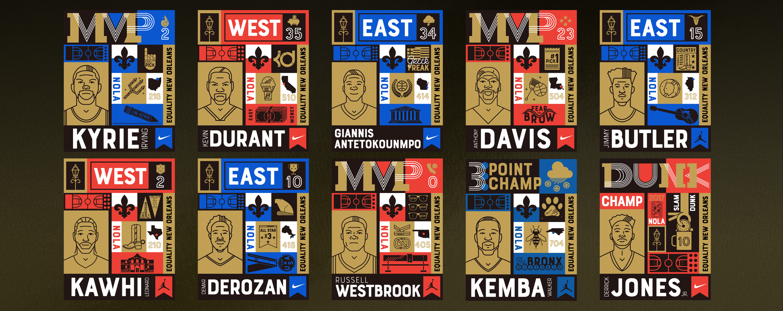 I worked with the team at Studio Mega to create the visual identity, illustration library toolkit, and custom apparel graphics for Nike and Jordan Brand’s NBA All-Star Week activation in New Orleans. The illustrations were used on special-edition lapel pins, patches, and on apparel. Part of the ask was to create a modular graphic system of illustrations that could be used to make reactionary and custom t-shirts that were printed on-site. Fans also got the opportunity to customize their own shirts with their cities, area codes, and a selection of special player and New Orleans-inspired illustrations.